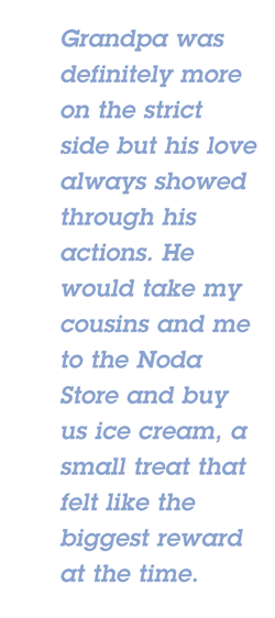 Grandpa was definitely more on the strict side but his love always showed through his actions. He would take my cousins and me to the Noda Store and buy us ice cream, a small treat that felt like the biggest reward at the time. We would all pile into the back of his small Toyota truck. Looking back, it probably wasn’t the safest idea but it’s a memory that makes me smile every time I think about it. He also took us to the beach, where he would sit on the shore watching over us as we swam in the ocean, always quietly making sure we were safe.