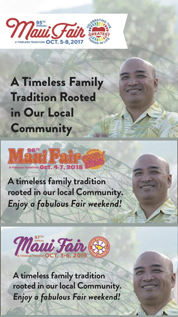The final three Maui Fairs (from left) before the Pandemic had the following themes: “Celebrating the Greatest Things in Life,” “Celebrating the Good Ol’ Days,” and “Make Memories – Share Moments.”