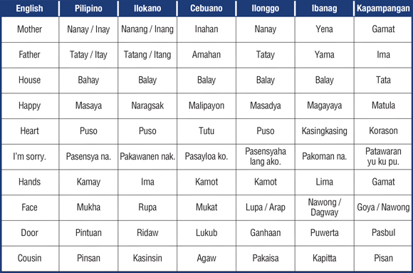 Happy, Happy birthday to you! Maligayang bati sa inyong kaarawan! (Tagalog) Naimbag nga panagkasangay mo! (Ilokano) Makapagayaya nga aggaw na nikeyana mu! (Ibanag) Masayang kebaitan queca! (Kapampangan) Masadya gid nga adlaw sa imo pagkatawo! (Ilonggo)