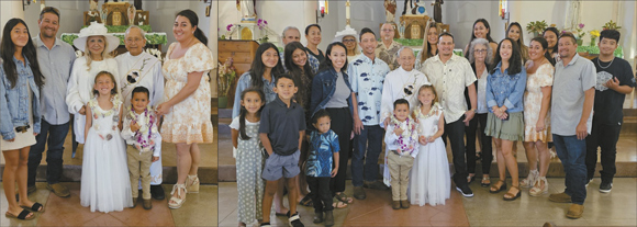 Jonathan and Shardi Tavares’ family—Patrick Constantino’s grandchildren and great grandchildren Kensley and Skyler were baptized at Holy Rosary Church in Pā‘ia